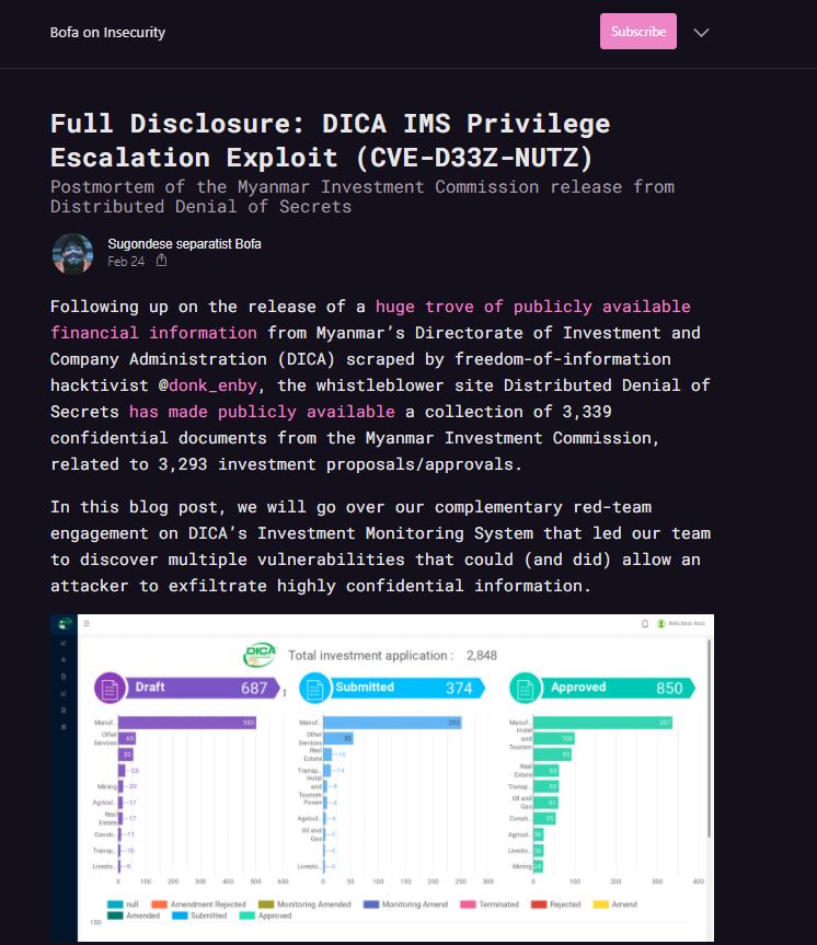 이러한 상황에서, 지난 2월 말, 한 해커가 공개시킨 미얀마 투자 및 기업관리국(DICA)의 데이터가 내부고발 데이터공유 단체인 DDoSecrets(Distributed Denial of Secrets)를 통해 공개되었습니다.