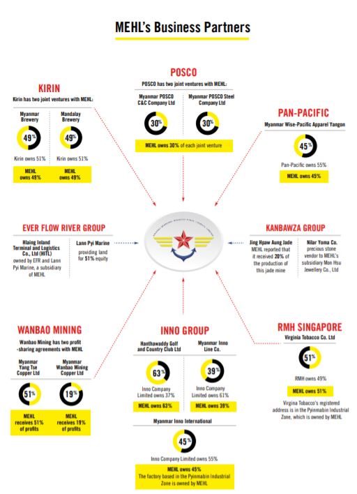 본 보고서에서는 군부가 운영하는 기업인 MEC(Myanmar Economic Corporations) 및 MEHL(Myanmar Economic Holding Limited)와 합작하여 현지에서 사업을 하고 있는 외국기업들의 명단을 발표했는데, 한국의 POSCO, INNO그룹 등의 기업이 직접적으로 군부 자금과 연루된 것으로 나타났습니다.