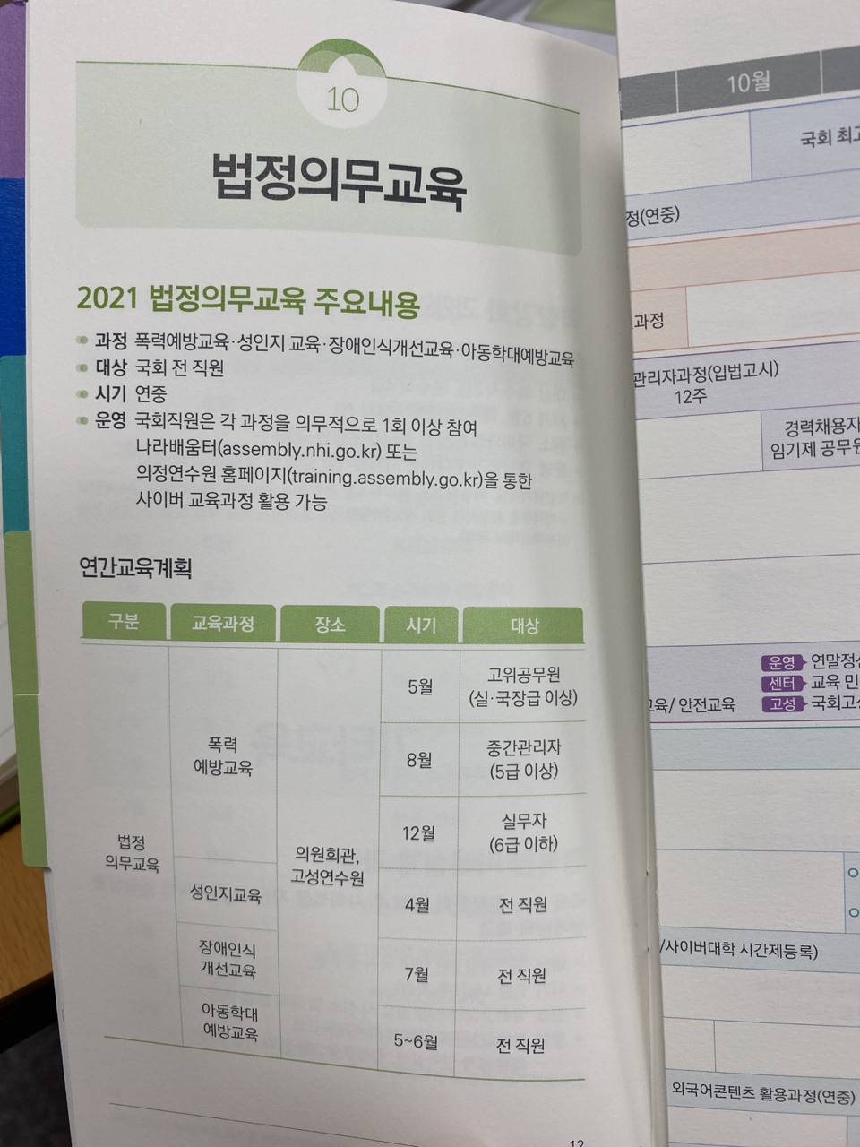 국회사무처나 국회도서관 직원들은 예방교육을 의무적으로 이수해야 하는데, 국회 보좌진들은 교육 대상이 아니기 때문일까요? 호기심이 생겨 정보를 찾아보다가 국회의원실에 배포된 '2021 국회 교육과정 안내'라는 팸플릿을 발견할 수 있었습니다. 이 팸플릿의 안내를 통해 국회 의원실 보좌 직원들 역시 나라배움터나 의정연수원 홈페이지를 통해 법정의무교육으로 이수해야 한다는 사실을 확인할 수 있었습니다.