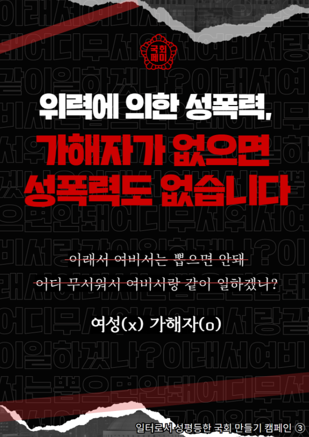 성평등한 사회를 만드는 것에 있어서 입법기관인 국회의 중요성은 더 이야기해봐야 입이 아플 것입니다. 따라서 국회에서 여성의 대표성을 확대하는 것 만큼이나, 국회의원의 의정활동 전반에 관여하는 국회 보좌진들이 얼마나 성인지적 태도를 갖추고 있느냐도 '성평등 국회'를 이루기 위한 조건이라 할 수 있습니다. 그러나 '국회페미'의 조사 내용에 따르면 국회 보좌진들이 오히려 한국 사회 일반의 기본적인 성인지적 태도에도 미치지 못하는 수준으로 보입니다. 과연 국회 보좌진들에게 성평등을 위한 기초적인 교육이 제대로 이뤄지고 있는지 의심이 들 정도였습니다.