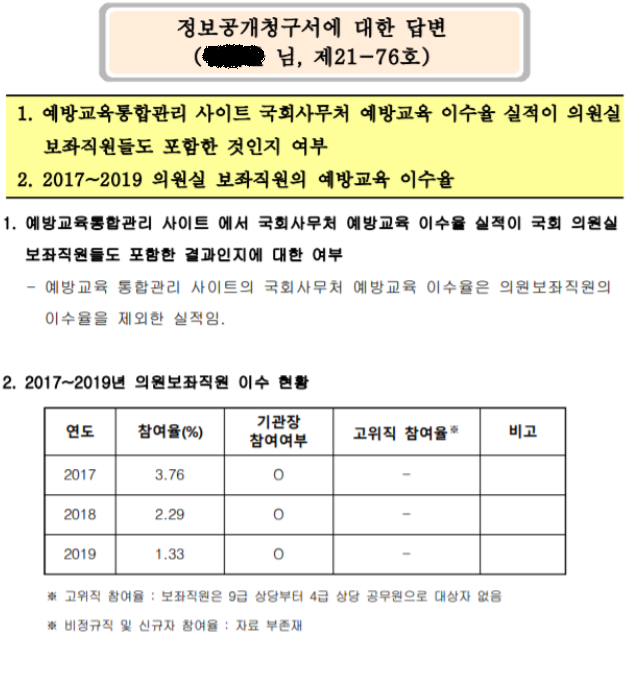 국회 보좌진들의 교육 이수율을 예방교육통합관리 사이트에서 확인할 수 없고, 국회에 정보공개 청구를 하고 나서야 볼 수 있었다는 점 역시 문제입니다. 보좌진 뿐 아니라 국회의원 개개인이 법정의무교육에 제대로 참여하고 있는지, 시민들 모두가 확인할 수 있어야 하지 않을까요?