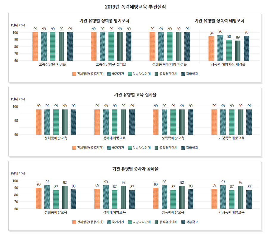 양성평등기본법에 따라 모든 공공기관은 4대 폭력 예방교육(성희롱 예방교육, 성매매 예방교육, 성폭력 예방교육, 가정폭력 예방교육)을 실시하도록 되어 있습니다. 여성가족부는 공공기관 예방교육통합관리 사이트를 통해 공공기관의 교육 이수 현황 등을 공개하고 있는데요, 이에 따르면 99%의 공공기관이 4대 폭력 예방교육을 실시하고 있으며, 평균적으로 전체 공공기관 직원의 90% 가량이 교육에 참여하고 있습니다. 공공기관이라면 어디나 실시해야 하고, 공공기관 직원이라면 누구나 들어야 하는 가장 기본 중의 기본인 교육인셈입니다.