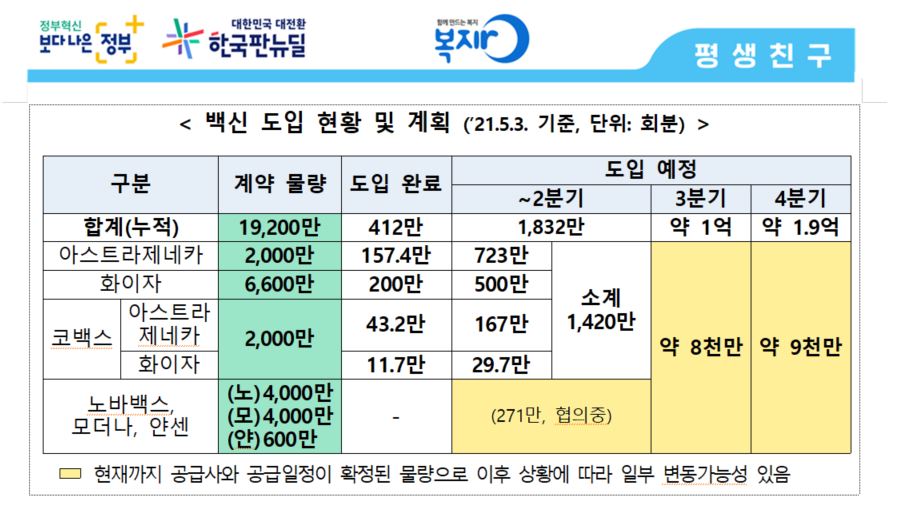 지난 5월 3일 정부에서 발표한 2분기 예방접종 수정계획에 따르면, 현재까지 정부가 백신 공급 계약을 체결한 제약사는 아스트라제네카와 화이자, 노바백스, 얀센, 모더나 총 5곳. 아스트라제네카와 화이자는 2분기까지 1420만 회(710만 명분) 도입이 예정되어 있으며, 다른 제약사들의 경우 도입물량을 협의 중입니다.