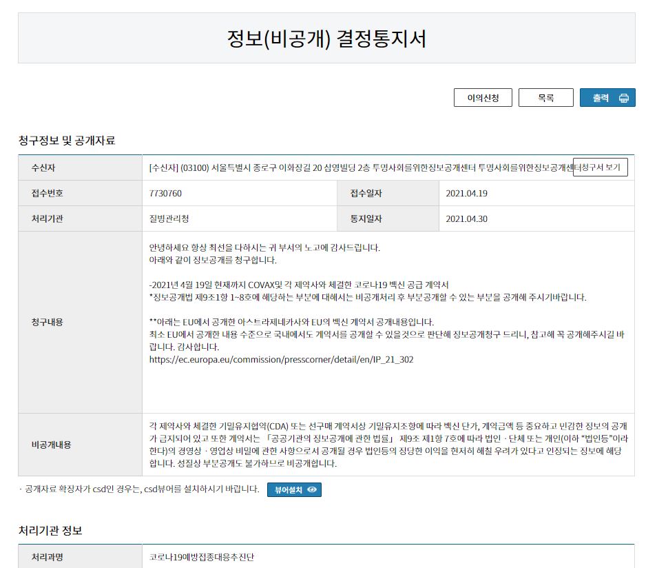 EU와 미국의 경우 계약서의 주요 부분을 가리고 공공에 공개하고 있습니다. 이에 정보공개센터에서는 질병관리청에 백신 계약 현황에 대한 정보공개청구를 했지만, 우리 정부는 그마저도 공개할 수 없다고 답했습니다. 이유는 '각 제약사와 체결한 기밀유지협약(CDA) 및 선구매 계약서상 기밀유지조항에 저촉되기 때문'이라는 것입니다. 계약서 유무나 형태라도 공개한 나라들에 비해 실체조차 '비공개'로 일관하는 것은 백신 정책에 대한 신뢰를 오히려 저해하는 과도한 비공개 결정입니다.