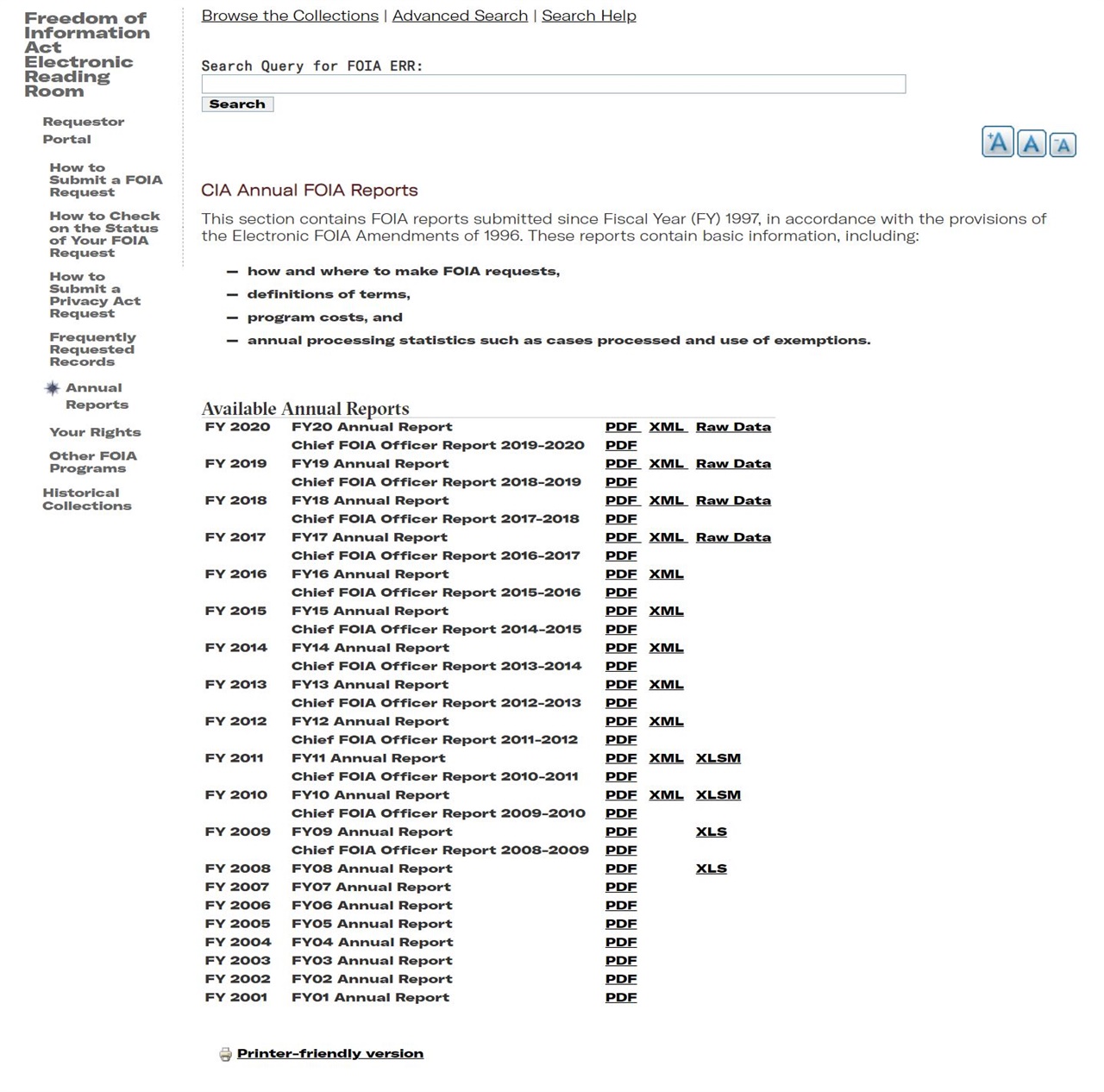 미국 정부 기관들의 경우에는 <정보공개연차보고서>(FOIA Annual Report)를 각 기관별로 따로 작성해서 제출·공개하도록 되어 있는데 CIA의 <연차보고서>도 이 전자 열람실에 매년 업로드 된다. CIA의 <연차보고서>에는 정보공개청구 방법부터 해당 연도에 정보공개의 공개, 부분공개, 비공개, 비공개 사유별 데이터, 정보공개처리 소요시간 데이터 등이 수록되어 있다. 또한 이용자가 편리한 형태로 접근·이용·분석이 가능하도록 PDF 파일, XML 코드, 엑셀 파일로도 제공된다.