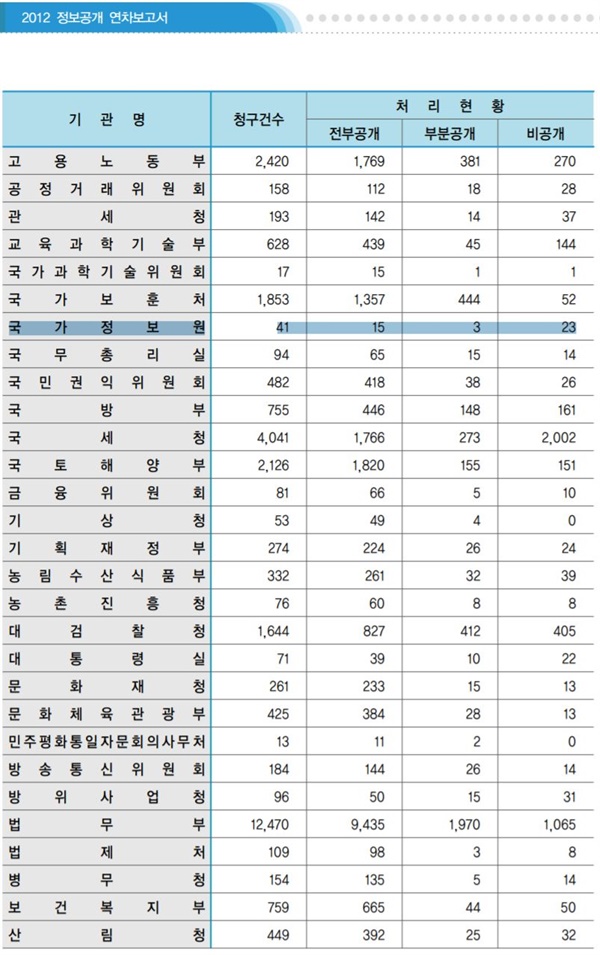 또 정보공개도 주무 부처인 행정안전부는 모든 정부 기관들의 정보공개제도를 적절하게 운영하는지 파악하기 위해 정보공개처리현황 자료를 담은 <정보공개연차보고서>(이하 연차보고서)를 발간하고 있다. 그런데 이 <연차보고서>에는 국가정보원이 아예 누락되어 있다.