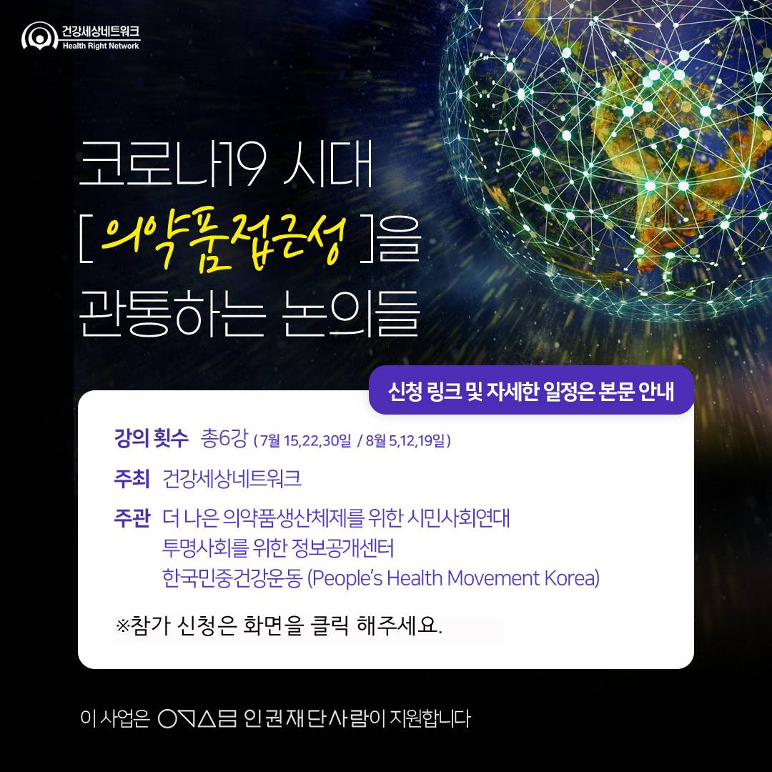 코로나19라는 유래없는 팬데믹과 함께 백신 및 치료제를 누가 언제 맞을 수 있느냐가 모두의 화두가 되었습니다. 오래 전 부터 의약품의 개발과정, 가격이 공중의 보건권에 미치는 영향에 대해서 시민사회와 전문단체들의 고민과 투쟁이 있어왔지만, 반복되는 감염병으로 인한 공중보건위기와 빅데이터 및 AI에 의한 고가의 의약품 및 의료기술 개발을 맞이한 지금, 그 어느때보다 함께 의약품 접근권에 대해 고민하고 지혜를 모으는 것이 필요합니다.
