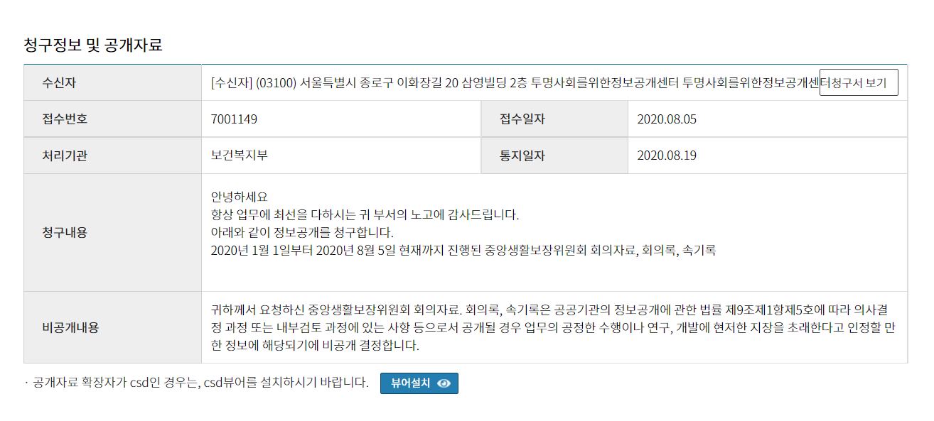 논의내용을 기록한 회의록을 비공개 하는 문제도 심각합니다. 지난 2020년 7월 31일 보건복지부가 기준중위소득 2.68% 인상을 발표한 이후, 정보공개센터는 2020년에 진행된 중생보위 회의의 회의자료, 회의록, 속기록을 정보공개청구 한 바 있습니다. 그러나 보건복지부는 '의사결정 과정 혹은 내부검토 과정중에 있는 사항으로 공개 될 경우 업무의 공정한 수행에 지장을 초래한다'고 주장하며 회의의 내용을 일체 비공개 했습니다.