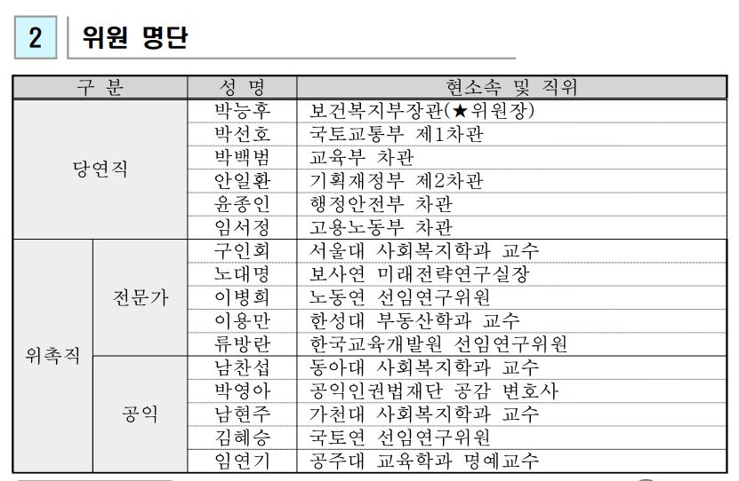 중생보위는 관계부처(보건복지부, 국토교통부, 교육부, 기획재정부, 행정안전부, 고용노동부) 장차관 6명, 공공부조 또는 사회복지와 관련된 학문을 전공한 전문가 5명, 공익을 대표하는 위원 5명으로 구성됩니다.
