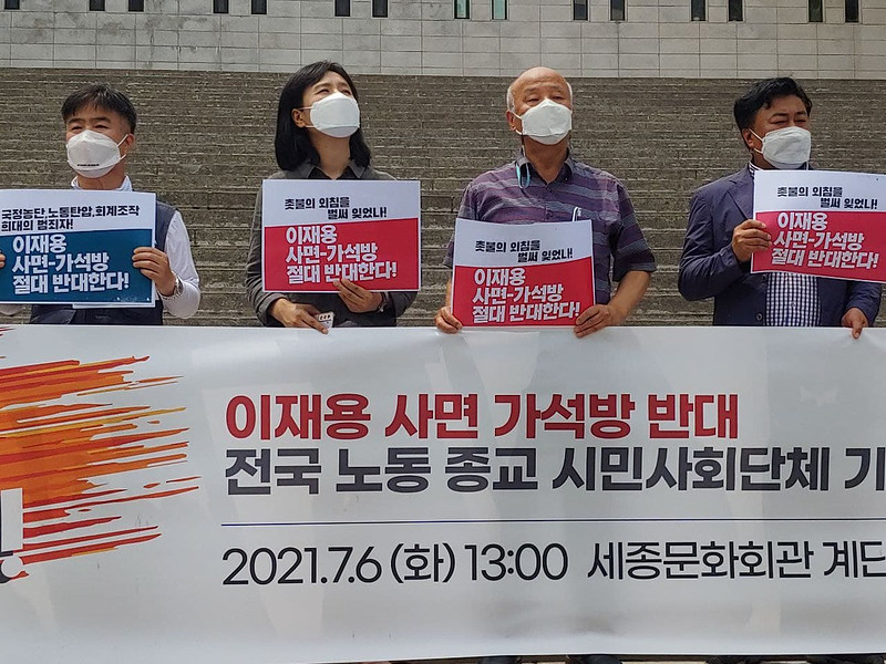 문재인 대통령은 대선공약에서 횡령, 배임 등 경제범죄에 대한 엄정한 법 집행과 사면권 제한 추진을 약속했다. 이재용 부회장이 사면 혹은 가석방 된다면 이러한 약속을 뒤집는 것에 다름 아니며, 명백한 자기부정이다. 문재인 대통령이 과거와 같은 솜방망이 처벌을 되풀이한다면 재벌 총수들은 또 다시 경제권력을 이용해 정경유착을 저지를 것이며, 불행한 국정농단의 역사는 반복될 것이다. 유전무죄 무전유죄의 경제범죄는 계속해서 극성을 부릴 것이고 공정한 사회로의 꿈은 또다시 한발짝 멀어질 것이다. 문재인 대통령과 더불어민주당은 사면론과 가석방 논의를 당장 중단하라. 언론은 삼성물산 불법합병 재판에 부당한 영향력을 미칠 가능성이 높은 편파적인 여론몰이를 즉각 중단하라. 우리 제 노동⋅인권⋅시민사회단체들은 이재용 부회장의 석방을 저지하고 그 죗값을 다 치를 때까지 끝까지 함께 연대해나갈 것이다.