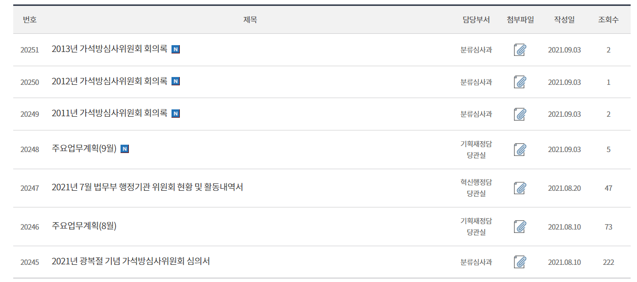 가석방심사위원회 희의록은 법무부 예규에 따라 가석방 심의 5년 이후부터 홈페이지를 통해 공개하도록 되어 있는데요, 5년이 지난 자료도 그동안 공개하지 않고 있었죠.