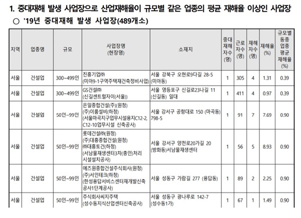 ▲ 고용노동부가 공개하는 산업재해 다발 사업장 명단 일부 ⓒ 고용노동부