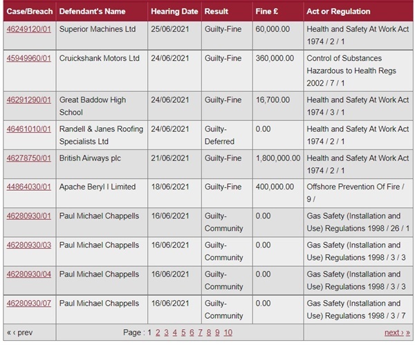▲ 영국 보건안전청에서 공개하는 보건안전법 위반 기업 데이터 ⓒ 영국 보건안전청