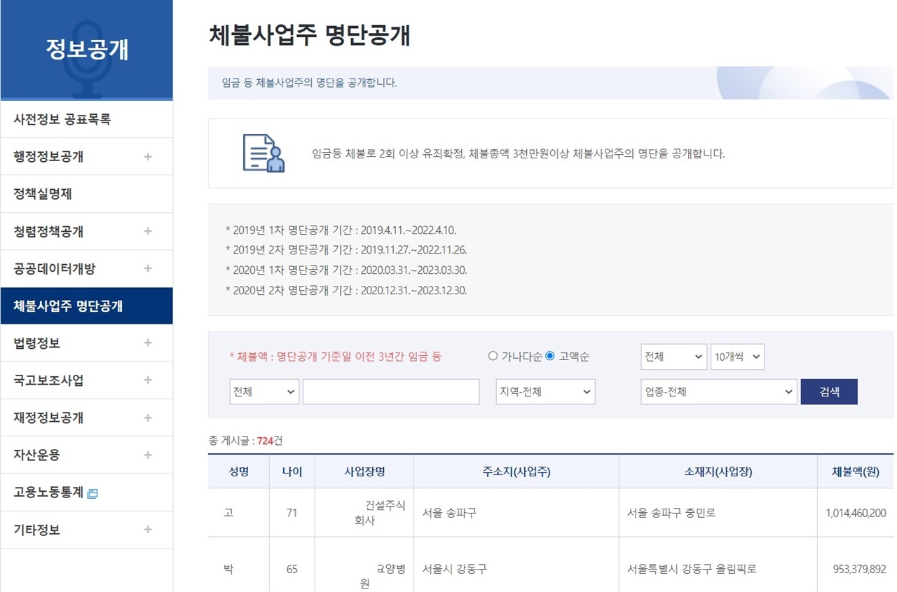 고액 상습체납자 명단의 경우 앞서 살펴봤듯이 국세청 홈페이지에서 지도로 친절하게 세급체납자들의 정보를 공개합니다. 임금체불 사업주 역시 고용노동부 홈페이지에서 따로 메뉴를 만들어 바로 찾아볼 수 있습니다.