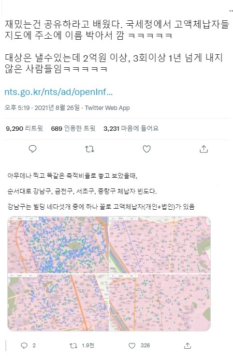 얼마 전 트위터에서 국세청의 고액세금체납자 명단 지도 서비스가 인기를 모았습니다. 국세청은 국세기본법에 따라 체납기간 1년 이상, 체납 국세가 2억 원 이상인 고액상습체납자의 명단을 공개하고 있는데요, 국세청 홈페이지에서는 이 명단을 지도 형태로 공개하여, 고액체납자들의 성명, 직업(업종), 주소, 체납액, 체납건수, 체납요지 등 다양한 정보를 누구나 살펴볼 수 있도록 하고 있습니다(링크). 해당 서비스가 인기를 끌면서, 많은 트위터 이용자들이 강남구에 고액체납자들이 몰려 있다는 사실을 알리거나, 전직 대통령의 세금 체납 액수를 공유하기도 했습니다.