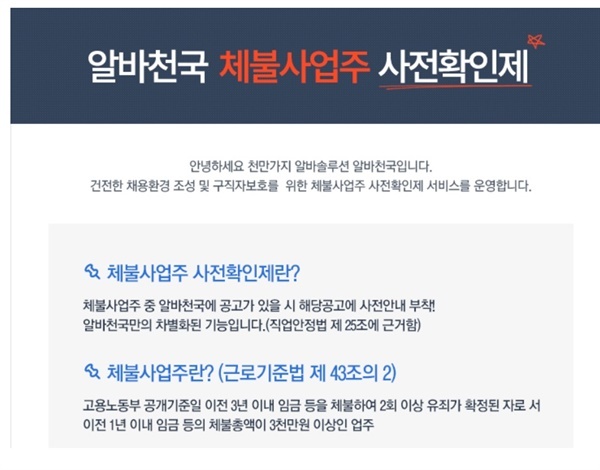 ▲ 구인구직 사이트 알바천국에서는 체불사업주의 구인공고에 사전안내를 제공한다. ⓒ 알바천국