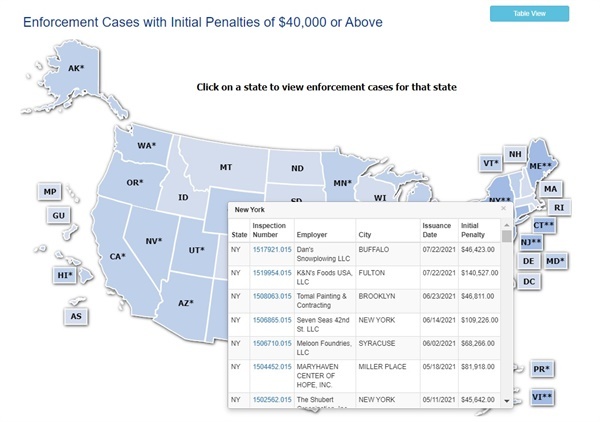 ▲ 미국 산업안정보건청의 산업안전보건법 위반 사업장 공개 ⓒ 미국 산업안전보건청