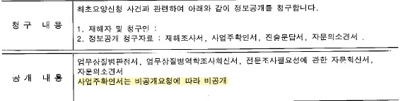 산업재해를 승인 받기 위해서는 질병의 업무 관련성을 피해자가 입증해야 하는 불공정한 구조에서, 그렇다면 입증 자료를 달라고 하니 정보공개법 상의 근거도 없이 그냥 비공개를 한 것입니다. 공공기관이 정보공개법을 어기면서까지 노골적으로 ‘제3자’인 사업주의 편에 선 셈입니다.