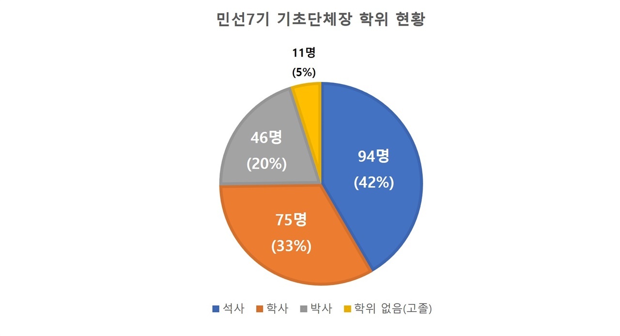 또한 대학 졸업 이상의 학력을 가진 기초단체장 215명 중 석사학위를 지닌 기초단체장이 94명에 달했다. 이는 전체 기초단체장 중 41.5%로 국회의원의 석사학위 보유 비율인 42%와 거의 동일했다.