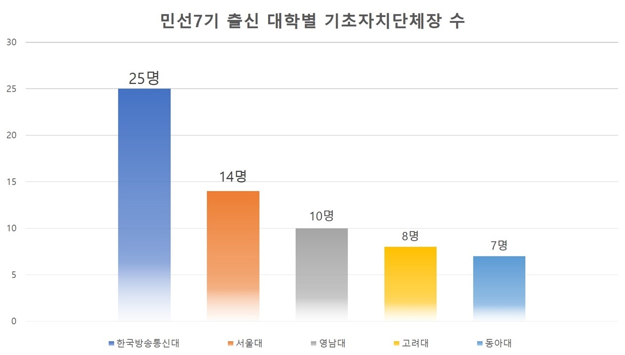 17개 광역단체에 소속된 226개 기초자치단체장들의 출신 대학은 한국방송통신대가 가장 많은 것으로 나타났다. 총 226명의 기초단체장 중 약 11%에 해당하는 25명이 한국방송통신대에서 공부했다. 한국방송통신대 다음으로는 서울대 출신 기초단체장이 14명으로 뒤를 이었다. 그밖에는 영남대(10명), 고려대(8명), 동아대(7명) 출신 기초자치단체장들이 많았다.
