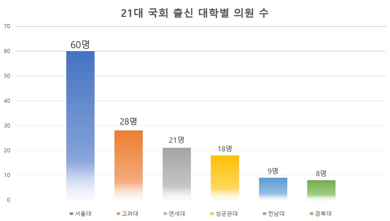 국회 홈페이지, 언론 보도 등을 종합해 21대 국회의원의 출신 대학을 분석한 결과 서울대 출신의 의원이 60명으로 가장 많았고 고려대와 연세대가 각각 28명과 21명으로 서울대의 뒤를 이었다. 이들 소위 SKY 대학 출신 의원들이 11월 현재 전체 의원 296명 중 109명으로 무려 36%가 넘는 비율을 보였다. 국회의원 10명 중 4명에 가까운 수가 SKY 대학 출신인 셈이다. 전국 대학교 수가 336개인 점(2021년 기준)을 감안하면 말 그대로 SKY 대학 출신 의원이 정치권의 수적 주류를 형성하고 있는 셈이다.