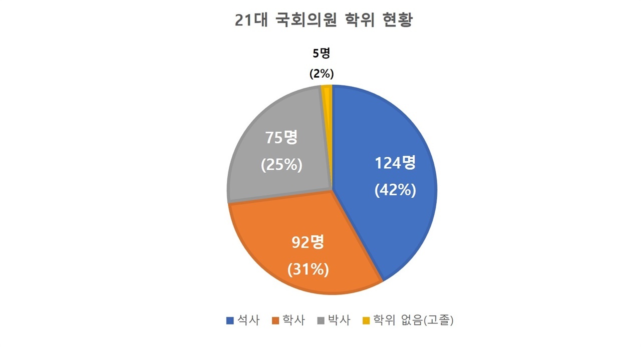 국회의원들은 높은 학벌 못지않게 학력도 길었다. 석사 학위를 마친 국회의원은 124명으로 무려 42%나 되었고 박사 학위까지 취득한 국회의원도 75명으로 25%에 달했다. 석·박사 국회의원들의 수를 합치면 총 199명으로 거의 70%에 가까웠다. 반면 대학 졸업 이하의 학력을 가지고 있는 국회의원들은 97명(33%)으로 100명이 채 안 되었다.