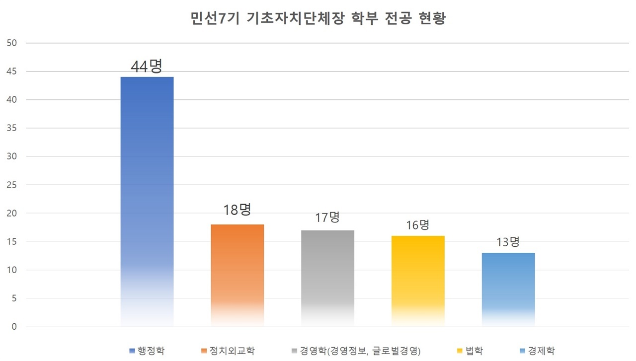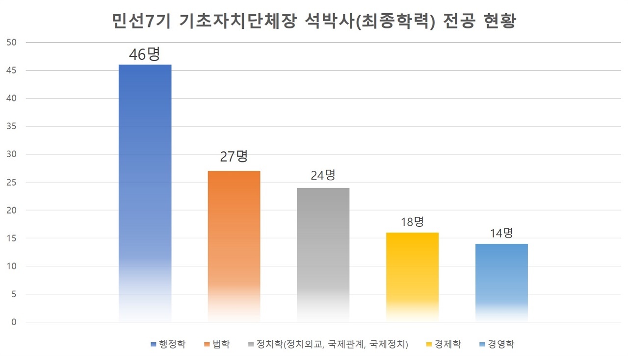 기초자치단체장들의 전공은 대학과 석·박사 전공 모두 동일하게 행정학 전공이 가장 많았다. 특히 석·박사 학위를 가진 기초단체장 140명 중 절반에 가까운 68명이 행정학(도시행정학, 공공행정학 등 포함)을 전공해 학위를 받았다(석사 49명, 박사 19명).