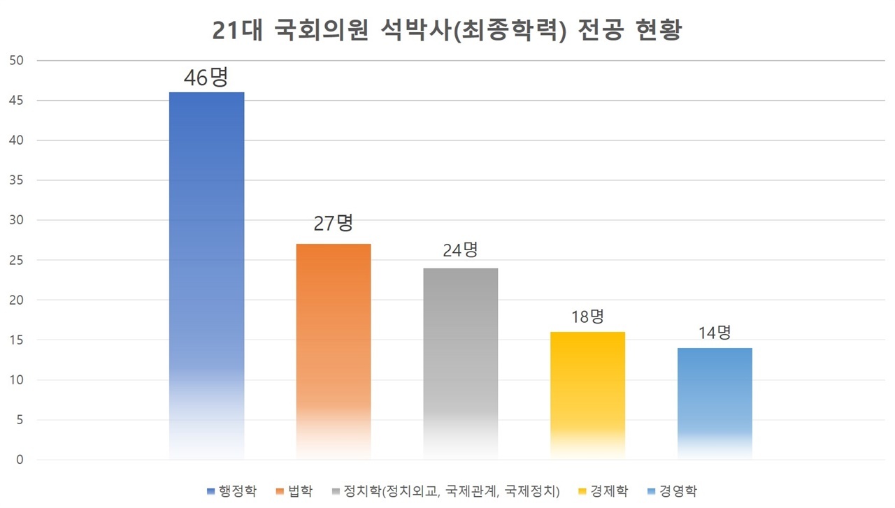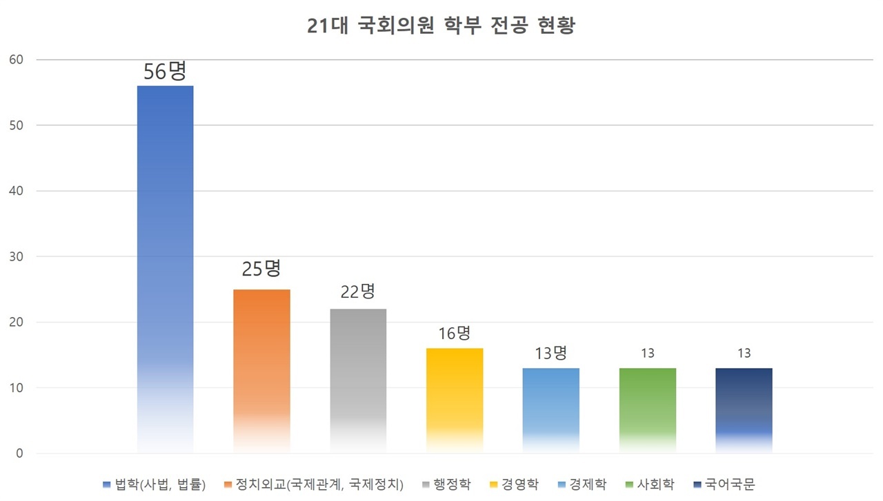 21대 국회의원들은 법학 전공자가 두드러지게 많았다. 법학 전공이 56명으로 21대 국회의원 전체의 20%가량이 법학 전공자들이었다. 그 외로는 정치외교학 25명, 행정학 22명으로 법학 전공자의 뒤를 이었다.