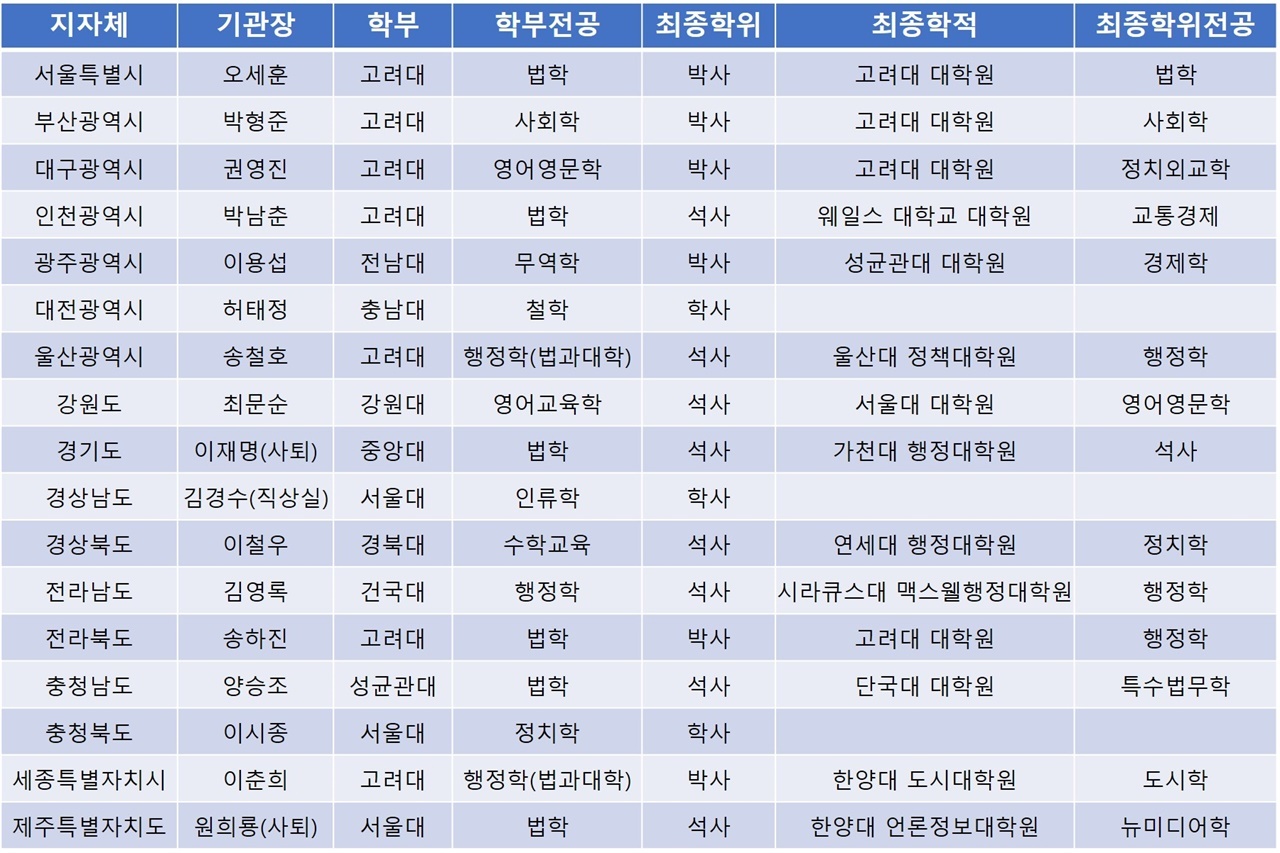 광역단체장들 중 지역거점 국립대학교 출신인 이용섭 광주광역시장(전남대), 허태정 대전광역시장(충남대)과 최문순 강원도지사(강원대), 이철우 경상북도지사(경북대)를 제외한 13명은 모두 서울 소재 4년제 대학을 나왔다. 또 이중 10명은 고려대와 서울대(3명) 출신이었다.