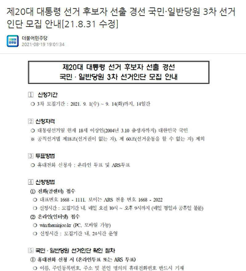 더불어민주당의 대선후보 경선 선거인단 모집 공고ⓒ자료사진
