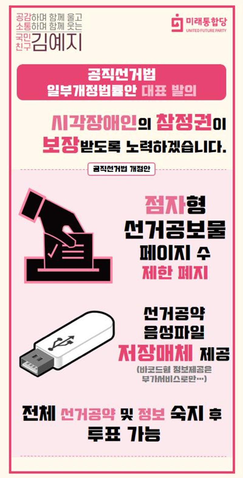 21대 국회의 유일한 시각장애인 국회의원인 국민의힘 김예지 의원은 과거 인터뷰에서 의정 활동에서 느끼는 어려움으로 그림이나 스캔 파일로 된 문서들을 읽기 곤란하다는 점을 토로한 바 있다. 김예지 의원은 장애인의 정보접근성 확대를 위해 점자형 선거공보물 면수를 확대하고, 음성이나 점자가 제공되는 디지털 파일을 USB로 제출하도록 하는 공직선거법 개정안을 발의하기도 했다. 그런데 정작 김예지 의원이 소속된 국민의힘은 자당의 국회의원도 대선과 관련한 공고를 확인하기 어렵도록 홈페이지를 운영하는 상황인 것이다.