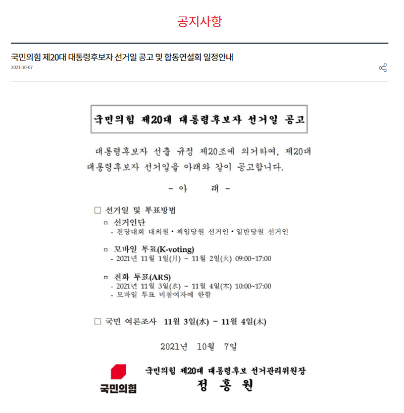 각 당 홈페이지에서 경선과 관련한 공고를 살펴보다가 깨달은 것이 있다. 더불어민주당이든, 국민의힘이든 선거 관련 공고를 이미지 파일로만 올리고 있지, 텍스트나 대체 텍스트, 혹은 워드 파일 등을 제공하고 있지 않다는 점이다. 예를 들어 국민의힘 경선과 합동연설회 일정을 알리는 ☞공고문은 상당히 많은 정보 값을 담고 있지만, 이미지 파일만 올라와 있다.