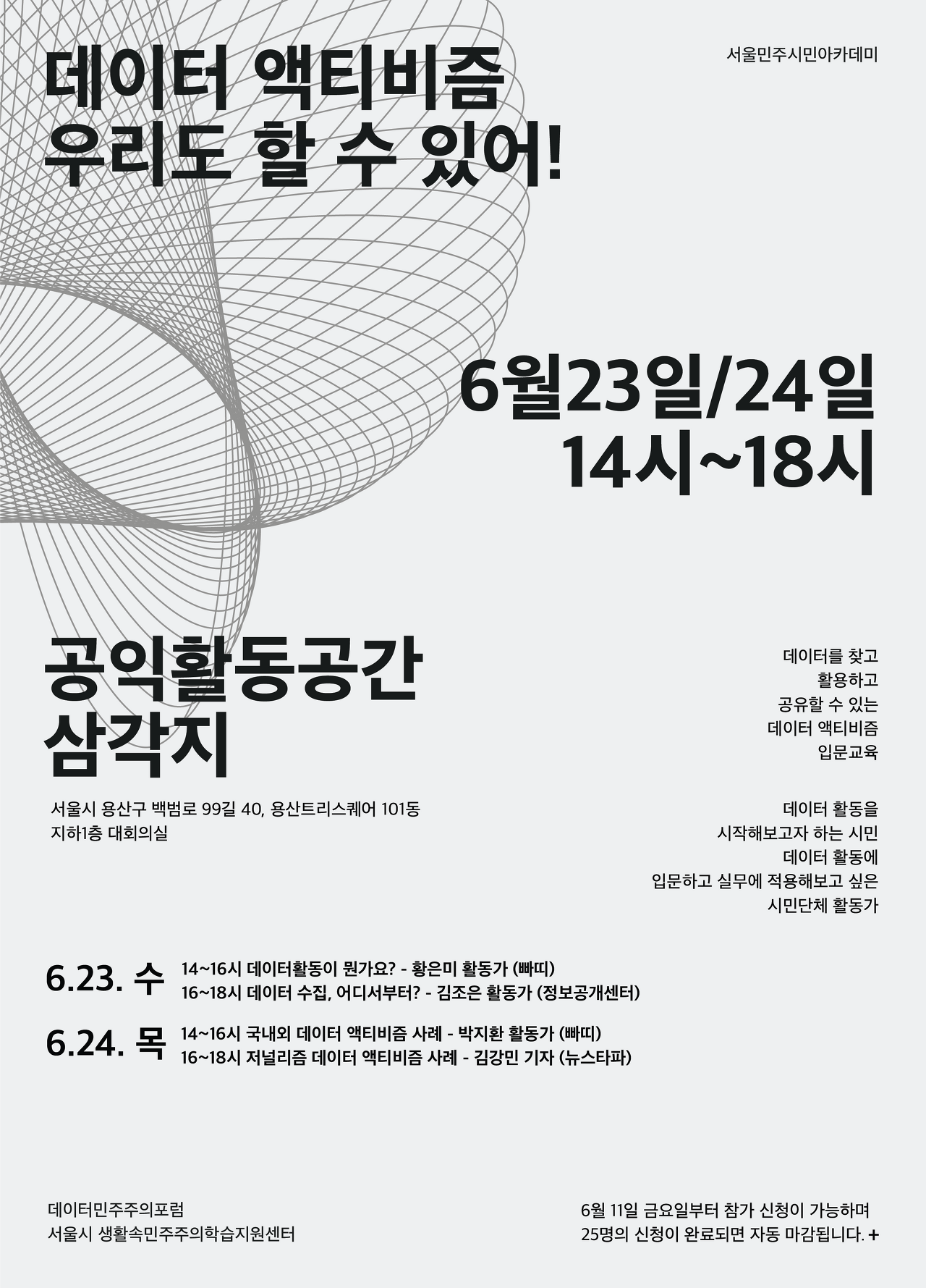 2021년 6월 23일 ~ 6월 24일 양일 동안 데이터민주주의포럼과 서울시 생활속민주주의학습지원센터가 함께 진행한 <데이터 액티비즘, 우리도 할 수 있어!> 교육 영상을 공유합니다.