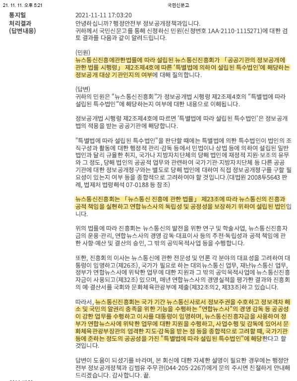 진흥회가 정보공개 대상 기관인 '특별법에 따라 설립된 특수법인'에 해당하는지에 대한 질의에 행정안전부는 "국가 기간 뉴스통신사로서 정보주권을 수호하고 정보격차 해소 및 국민의 알권리 충족을 위한 기능을 수행하는 '연합뉴스사'의 경영 감독 등 공공성이 강한 업무를 수행하고 이사를 대통령이 임명하며, 뉴스통신진흥자금을 사용하여 정부가 연합뉴스사에 위탁한 업무에 대한 지원을 수행하고, 사업수행 및 감독에 있어서 문화체육관광부장관의 엄격한 지도·감독을 받는 점 등을 종합적으로 고려할 때,국가기관 등에 준하는 정도의 공공성을 가진 '특별법에 따라 설립된 특수법인'에 해당" 한다고 판단했다.