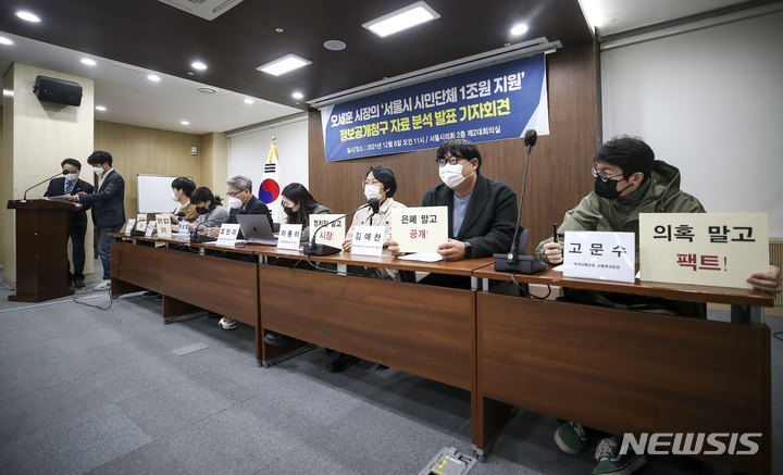 서울시민은 누구나 서울시가 가지고 있는 행정자료에 대해 정보공개를 요구할 수 있고, 서울시는 법률에 근거하여 자료를 투명하게 공개해야 할 의무가 있다. 시민이 법률이 정하는 절차에 따라 정당하게 요청한 정보에 대해 일부 내용만을 공개하면서 버젓이 전부 공개한 것처럼 행세하고 기만하는 것은 시민의 정보공개에 대한 권리를 침해하는 것이다. 지난 이경선 서울시의회 의원의 정보공개 요청에도 불구하고 끝까지 공개하지 않은 자료에 대해 비판 기자회견을 예고하자 언제 그랬냐는 듯이 자료를 제출하기도 하였다. 서울시정을 견제하기 위하여 부여된 자료제출권을 가진 서울시 의원을 포함한 시민들의 요구에 대한 서울시의 태도는 상식을 벗어난 것이다. 서울시는 시민의 권리인 정보공개에 대해 특별한 이유 없이 공개하지 않는 행태를 즉각 중단하고, 지체 없이 전부 공개할 것을 요구한다. 오늘 우리의 요구는 오세훈 시장이 지난 3개월 동안 기자회견을 통하여 일방적으로 시민사회를 폄하하면서도 근거를 제시하지 않았던 ‘1조원’ 에 대한 진실을 밝히는 과정에서 시작되었다. 서울시 바로세우기는 특정 주체를 비난하거나 책임 떠넘기기가 아니라 명확하게 드러난 문제를 해결하기 위해 제도를 개선하는데서 시작된다. 이를 위해 우리는 서울시와 대화할 준비가 되어 있다. 우리는 오늘 자료를 통해 드러난 사실을 바탕으로 서울시와 오세훈 시장이 시민사회에 대한 모욕을 당장 중단하고 공개적으로 사과할 것을 촉구한다.