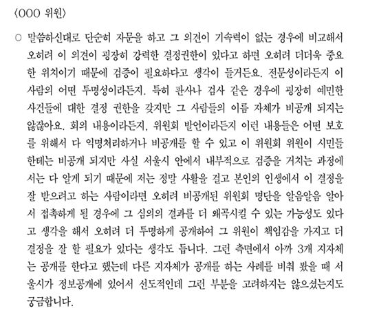 특히 서울시의 경우 이름 이외에 위원들의 현직 및 소속 정보까지 식별 불가능하도록 비공개해 어떤 이력이나 전문성을 가지고 성폭력 사안을 다루고 있는지 전혀 파악이 불가능했다. 서울시의 내부 감사 조직인 옴부즈만 위원회에서도 '심의위원회 위원 명단 비공개 자체가 근거 규정이 없고, 이례적이며, 비공개할 특별한 사정이 없다'라고 밝히며 공개를 권고했지만 결국 서울시는 명단을 공개하지 않았다.