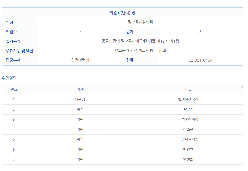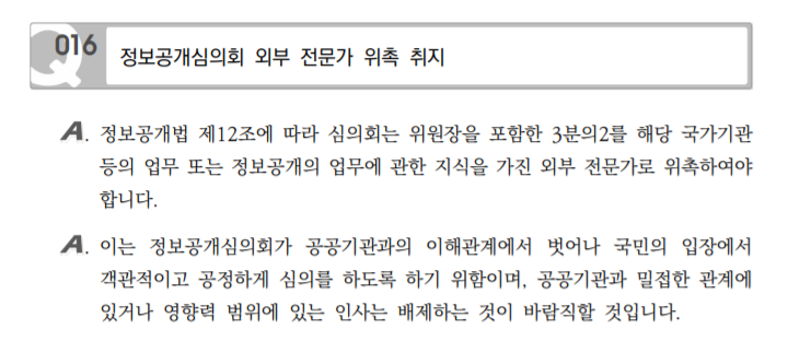 본래 정보공개심의회는 해당 공공기관의 공무원, 임직원을 포함하여 5~7명의 위원으로 구성하되, 그 중 위원장 1명을 제외한 나머지 위원의 ½ 이상을 해당 기관의 업무나 정보공개 분야에 대한 전문성을 지닌 외부 전문가를 위촉하고 있었습니다. 쉽게 풀어보자면, 전체 위원이 7명인 경우 위원장 1명, 기관 내부 인사 3명, 외부 전문가 3명으로 심의회를 구성하던 셈입니다. 전체 위원의 절반 정도는 외부 위원으로 구성이 되어야 기관의 이해관계와 독립적으로 심의가 이루어질 수 있다는 것인데요, 그런데도 불구하고 만약 해당 기관 소속인 내부 위원이 위원장이 된다면 심의회의 절반 이상을 내부 위원이 차지하는 셈이라 과연 공정한 심의가 이뤄지겠느냐는 우려도 적지 않았습니다.