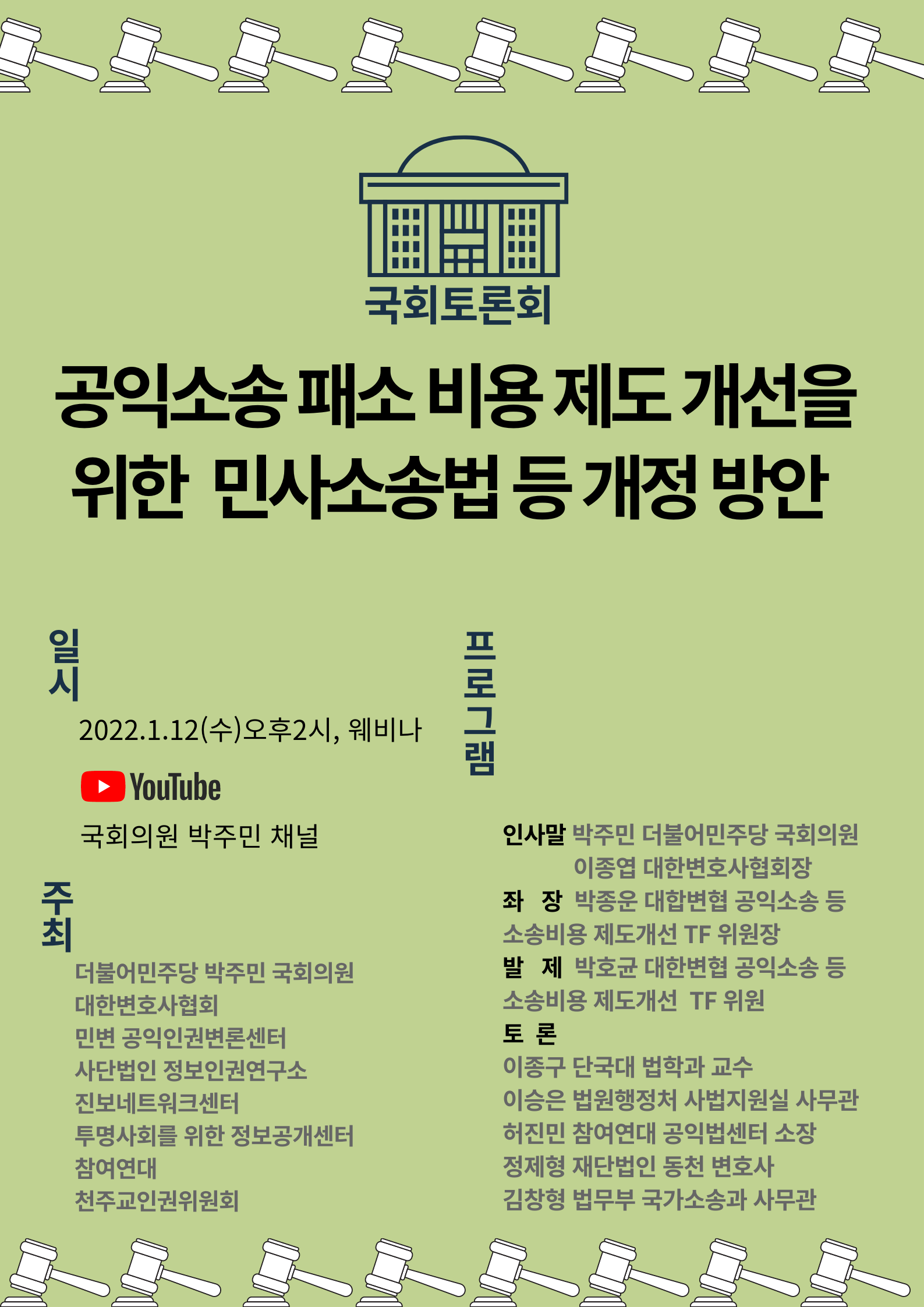 국회 토론회 자료집 공익소송 패소비용 제도개선을 위한 민사소송법 등 개정방안 일시 | 2022년 1월 12일(수) 오후 2시 장소 | 온라인 생중계 주최 | 더불어민주당 박주민 국회의원, 대한변호사협회
