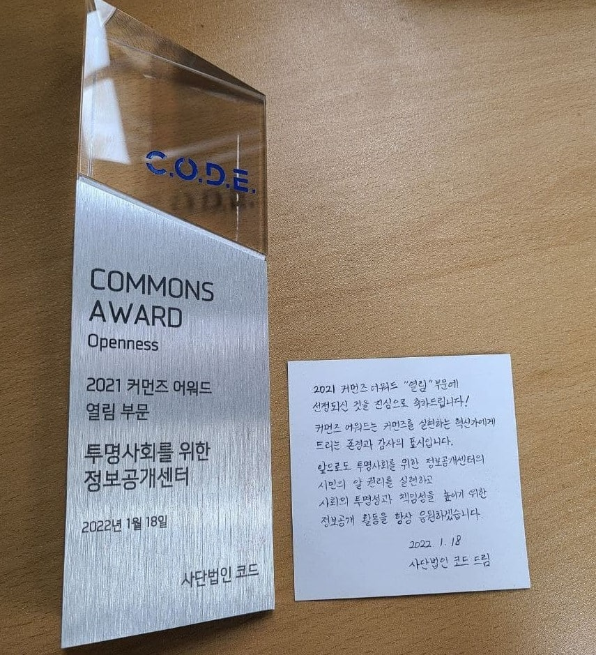 정보공개센터가 사단법인 코드가 주최한 제2회 커먼즈 어워드의 '열림' 부문을 수상하였습니다.