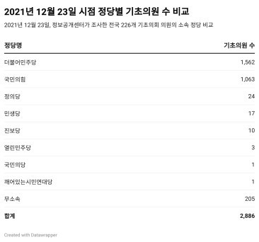 ▲ 정당별 기초의원 수 비교 (2021-12-23 기준) ⓒ 정보공개센터