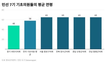 예를 들어보자면, 전국에서 가장 '젊은' 기초의회인 경기 과천시의회의 경우 의원들의 평균 연령이 48세입니다. 전체 기초의원들의 평균 연령이 58세라는 점과 비교하자면 열 살가량 낮은 셈입니다. 반대로 서울 종로구, 전북 장수군, 경남 산청군, 전남 함평군 등은 기초의원들의 평균 나이가 65세를 넘어섭니다.