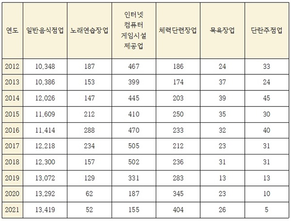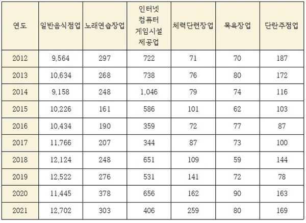 최근 10년 동안의 업종별 인허가 현황을 살펴보면 노래방과 PC방, 단란주점은 코로나 시기인 2020년과 2021년의 인허가 수가 눈에 띄게 감소했지만, 일반음식점과 헬스장, 목욕탕의 인허가 수는 큰 차이가 없다. 식당과 헬스장의 경우에는 인허가 수가 늘어나기도 했다.