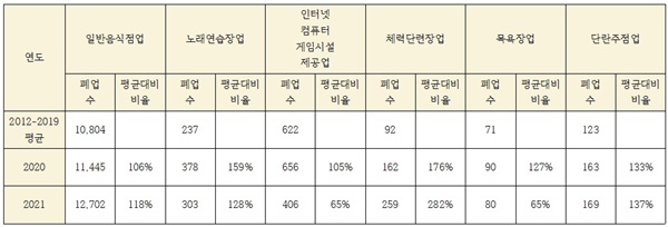코로나는 자영업의 창업을 감소시킬 뿐만 아니라 폐업은 늘렸다. 최근 10년 동안의 업종별 폐업 현황을 살펴보면 노래방, 헬스장, 목욕탕, 단란주점의 폐업이 증가 추세를 보이는 것을 알 수 있다. 일반음식점의 경우에는 폐업에 큰 추세 변화가 없으며, PC방의 경우에는 2021년 폐업 수가 평균 대비 줄어들기도 했다.