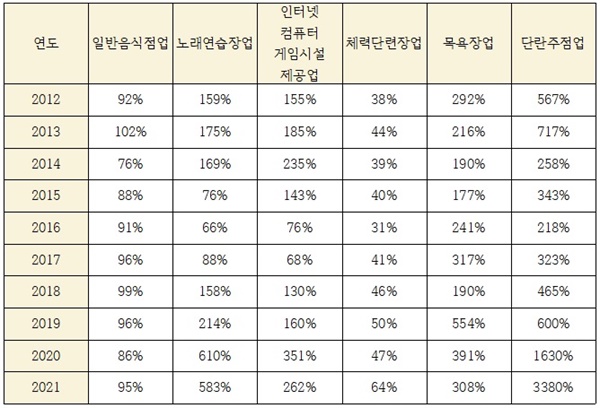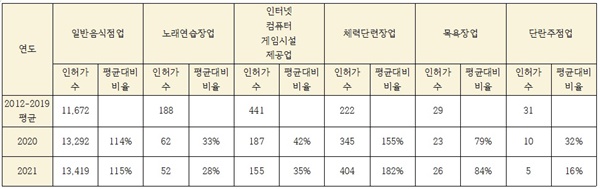 하지만 인허가 추이를 비율로 살펴보면 실제 창·개업이 많이 줄었음을 알 수 있다. 지난 10년을 기준으로 볼 때 2012년부터 코로나 직전인 2019년까지의 인허가대비 2020년과 2021년의 인허가 비율을 살펴보면 일반음식점과 체력단련장을 제외하고는 개업이 적은 것이 확연히 드러난다.