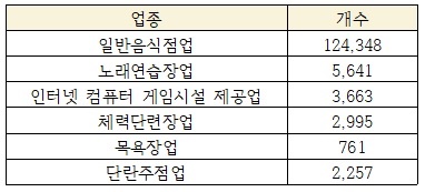 현재 서울에 영업 중인 주요 자영업 현황을 살펴보면(데이터 취합일 2022.02.07) 약 14만 개소가 영업중이다. 이 중 일반음식점이 12만 4천여 개로 가장 많고, 그 뒤를 노래방, PC방, 헬스장, 단란주점이 뒤를 잇는다. 목욕탕은 현재 영업 중인 곳이 서울 전체를 통틀어 761곳에 불과하다.