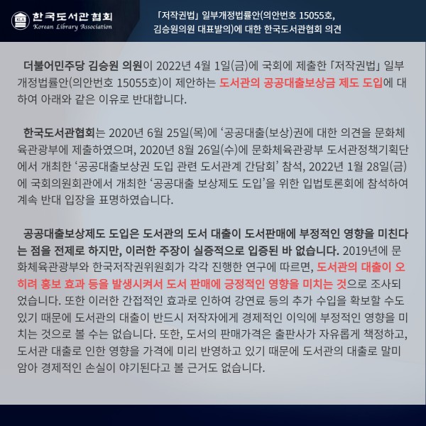 한국도서관협회는 이번 개정 법안에 대한 의견서에서 2019년에 한국저작권위원회가 발간한 ‘도서관 이용자의 도서관 이용 및 도서 구매 실태 설문조사’를 인용하면서, 도서관 이용자들이 1년간 평균 60권의 도서를 대출했고, 20권을 구입하고 있어 도서 대출이 많아질수록 도서의 구매는 오히려 증가하고 있다는 점을 지적하기도 했다. 게다가 수많은 사서들이 호소하듯 한국의 도서관은 ‘누구나 책 읽는’ 문화를 만들기 위해 다양한 책을 큐레이팅하고 행사를 기획하는 역할도 도맡고 있다. 저자를 초대하고 몰랐던 책을 소개해 관심을 가질 수 있는 계기를 주는 것인데 홍보를 통해 도서 판매에 긍정적인 영향을 미치고 있다고 보는 것이 더 합리적인 판단이다.