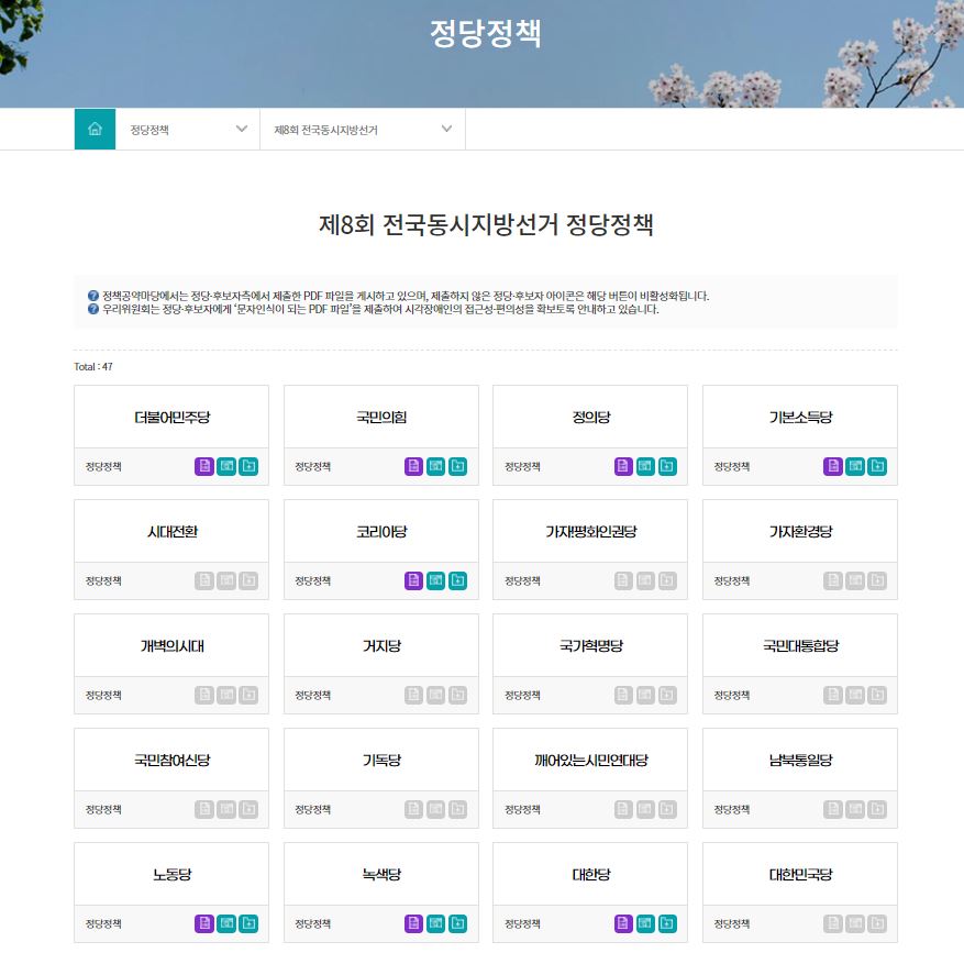 5월 9일 월요일, 제8회 전국동시지방선거에 참여하는 정당들의 10대 정책공약이 중앙선관위 '정책·공약마당(policy.nec.go.kr)'사이트에 공개됐다.