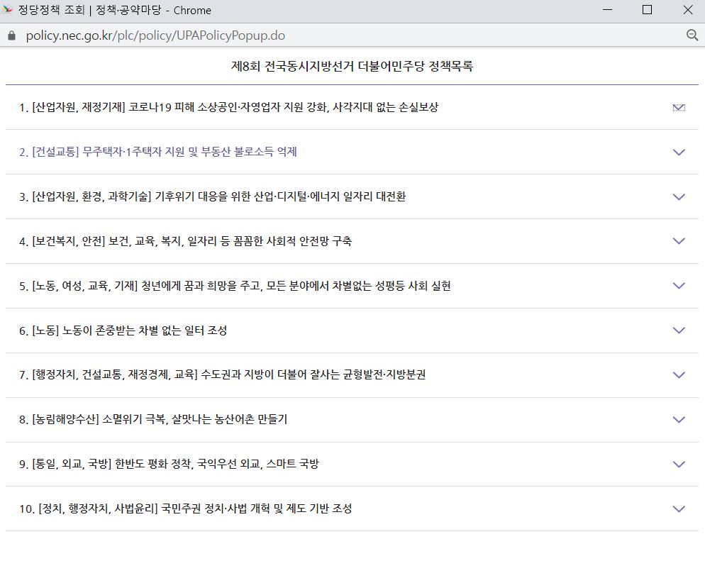5월 9일 월요일, 제8회 전국동시지방선거에 참여하는 정당들의 10대 정책공약이 중앙선관위 '정책·공약마당(policy.nec.go.kr)'사이트에 공개됐다.