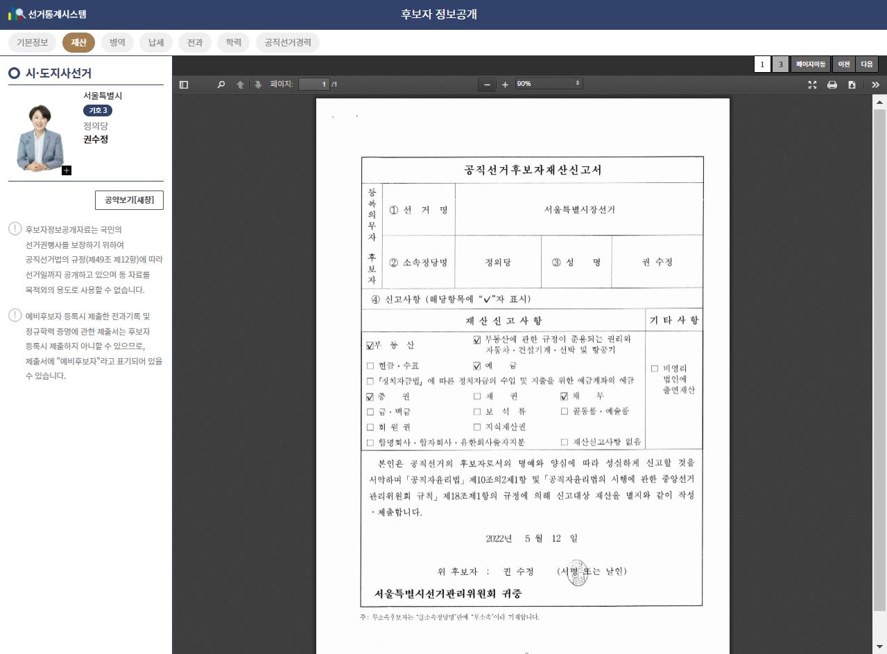 한국의 모든 공직선거의 후보자들은 공직자로서의 투명성과 책임성을 검증하기 위한 정보를 제출한다. 여기에는 기본적인 인적사항, 재산 및 병역사항, 최근 5년간 세금납부 및 체납실적, 전과기록이 포함되며, 선거관리위원회 홈페이지(https://www.nec.go.kr/)에 '선거 기간에 한해' 게시된다.