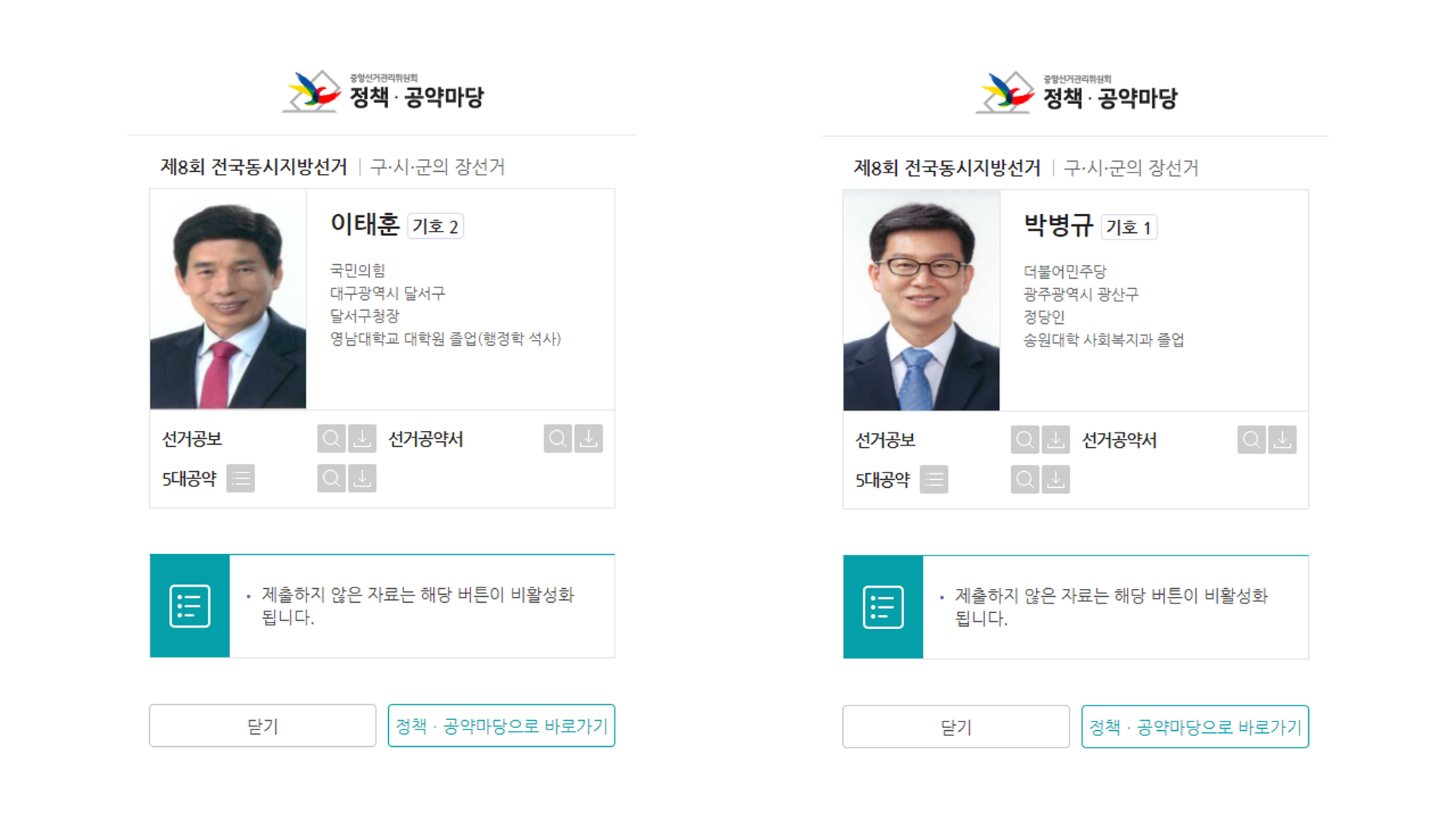 하지만 선거관리위원회 홈페이지에서도 후보들의 상세한 공약은 살펴볼 수가 없다. 선거운동이 불가능하니 공보물 제작 자체를 하지 않기 때문이다. 제작하지 않았으니, 제출할 것도 없었던 것이다.